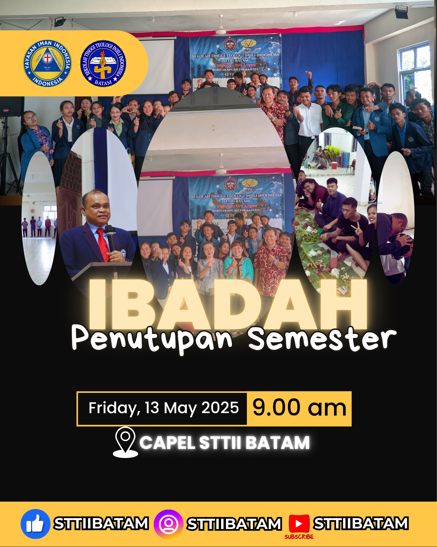 Pemberitahuan Penting untuk Seluruh Mahasiswa STTII Batam: Ibadah Penutupan Semester Segera Tiba! Kami mengundang seluruh mahasiswa Sekolah Tinggi Teologi Injili Indonesia (STTII) Batam untuk hadir dalam Ibadah Penutupan Semester yang akan segera dilaksanakan. Mari kita akhiri semester ini dengan ungkapan syukur dan doa bersama, sekaligus mempererat tali persaudaraan kita di kampus. Ibadah ini akan dilaksanakan pada: Hari/Tanggal: Jumat, 13 Mei 2025 Waktu: Pukul 09.00 pagi Lokasi: Capel STTII Batam Kehadiran Saudara/i mahasiswa sangat kami nantikan. Mari sukseskan ibadah penutupan semester ini!